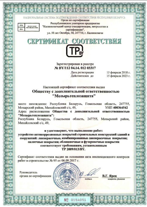 ОДО «Мозырьтеплозащита» – предприятие, выполняющее ряд специальных строительных работ на объектах промышленного, гражданского, жилищного и коммунального хозяйства.