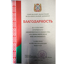 ОАО «Калинковичский мясокомбинат» получил благодарность от Гомельского областного исполнительного комитета за высокое качество продукта в 2015 году. Мы ценим такую высокую оценку нашей продукции и гарантируем, что и далее будем производить колбасы и мясную продукцию не худшего качества!