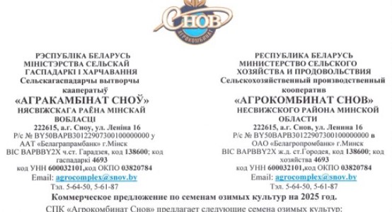 СПК «Агрокомбинат Снов» образован в 1951 году и на сегодняшний день представляет собой многоотраслевое сельскохозяйственное предприятие, которое специализируется на производстве мяса КРС, свинины и птицы, молока и продуктов его переработки. СПК «Агрокомбинат Снов» один из первых в стране начал работать по принципу «поле – ферма - переработка - прилавок - потребитель».